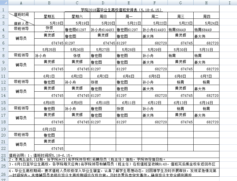 太阳集团城网站20182018届毕业生离校值班安排表
