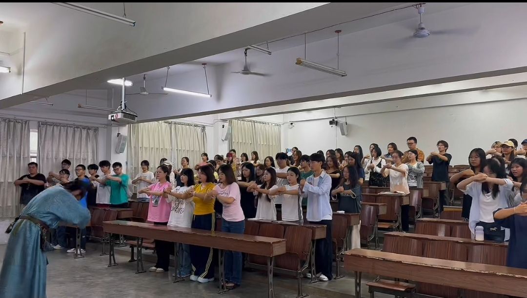 活动中,大鹏老师以一袭典雅唐装亮相,结合自身深耕文旅行业的实践经验与前沿动态,直面学生专业学习痛点,通过案例解析与互动引导,帮助同学们梳理兴趣方向、明确就业关键点。讲堂设置“唐装文化解读”“叉手礼体验”“匠心精神分享”等环节,从传统服饰的历史底蕴到古人礼仪的文化内涵,从唐代工匠“物勒工名”的责任意识到现代文旅项目的细节把控,让学生在沉浸式体验中感悟“文旅人既是文化传承者也是创新者”的使命。