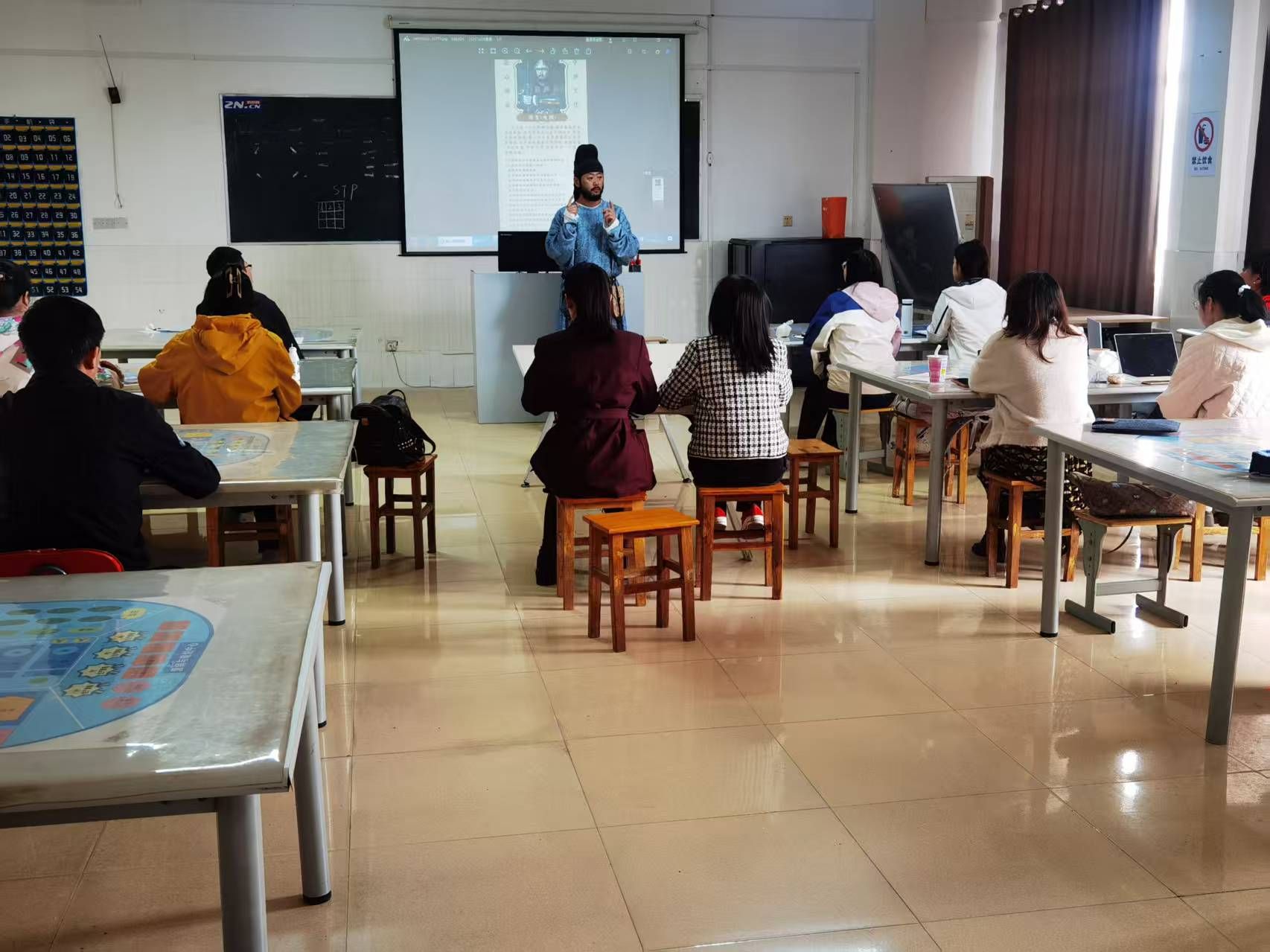 在课堂上,大鹏老师身着唐制圆领袍亮相,以传统服饰为切入点,生动地阐释了“文化是民族的灵魂”这一核心要义。谈及襄阳的历史文化,他如数家珍。从 “伏羲葬南郡,在襄阳” 的远古传说,到 “襄阳好风日,留醉与山翁” 的诗意咏叹;从羊祜镇守襄阳的忠勇担当,到孟浩然隐居鹿门的清雅风骨;从昭明台承载的南朝文脉,到古城墙镌刻的岁月沧桑……这些珍贵的文化符号在大鹏老师眼中是独属于襄阳的文旅密码。