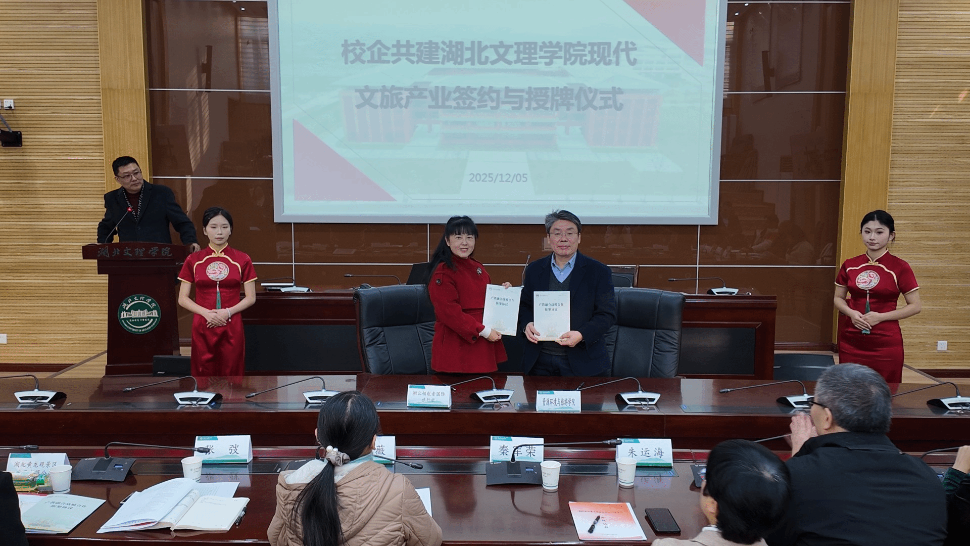 在与会嘉宾的共同见证下,秦军荣副校长为襄阳文化旅游集团有限公司、襄阳唐城旅游发展有限公司等16家共建单位授予“现代文旅产业学院共建单位”牌匾;张弢院长代表太阳集团城网站2018与各企业代表依次签署共建协议,并为朱向军、颜拥军、吴开美等12位行业专家颁发产业导师聘书。仪式后,部分共建单位代表结合企业运营实践,围绕文旅产品开发、业态创新与营销拓展等主题进行了经验分享与交流,内容富有启发意义。